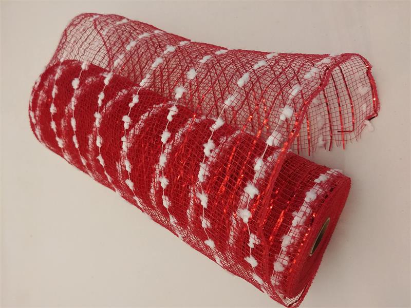 10" fabric mesh, rd w/white snowball, 10 yd. roll