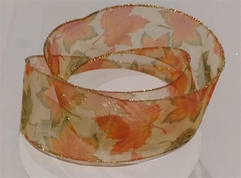 2.5" sheer ribbon w/fall leaves, 50yds