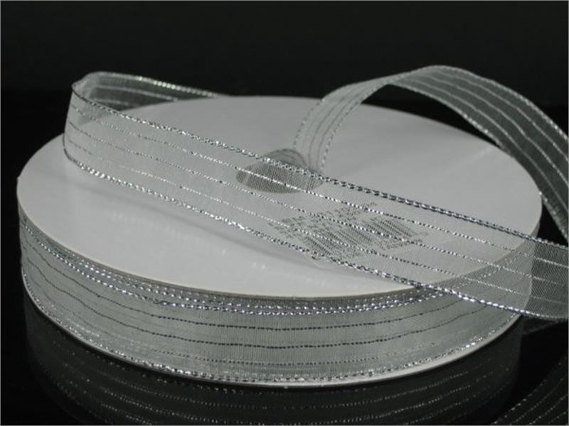 5/8 metalic pinstripe sheer ribbon x 50yds, white/silver